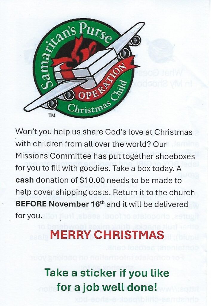 We also invite you to join us any Sunday morning for worship at 9:30 am. Worship generally lasts for one hour. Normally we sing from the hymnal “Our Great Redeemer”. We have plenty of parking and child